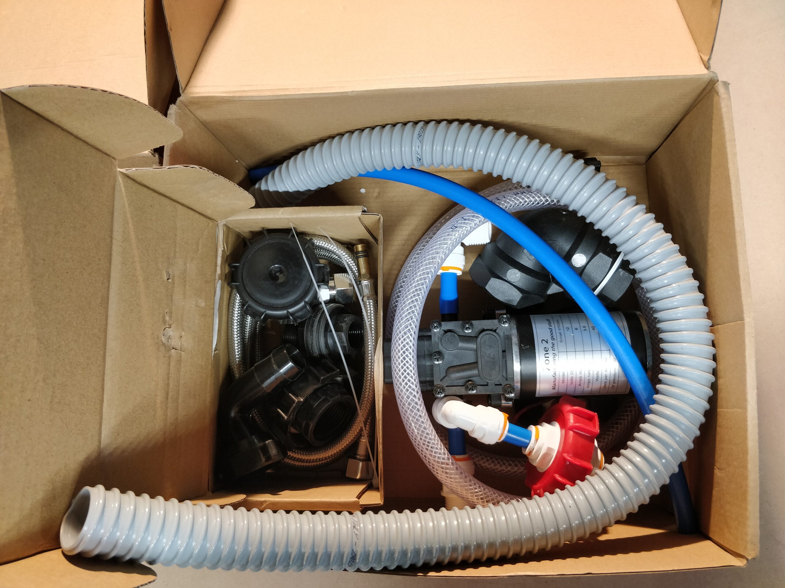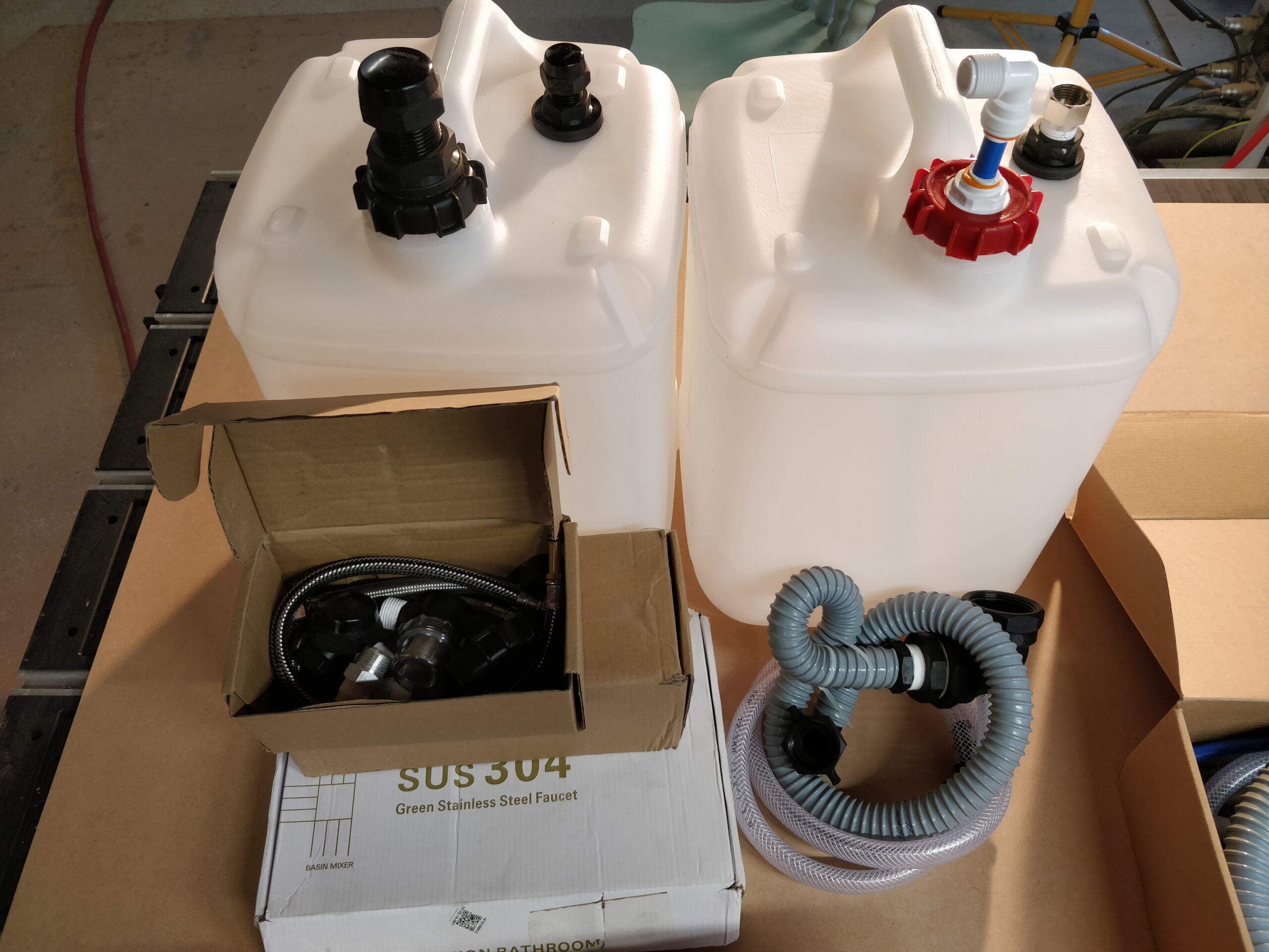 open the tap and turn off when you close the tap. Just like in a normal house! - 1 meter of braided flexible fresh water pipe, grey water pipe and grey water breather tube all